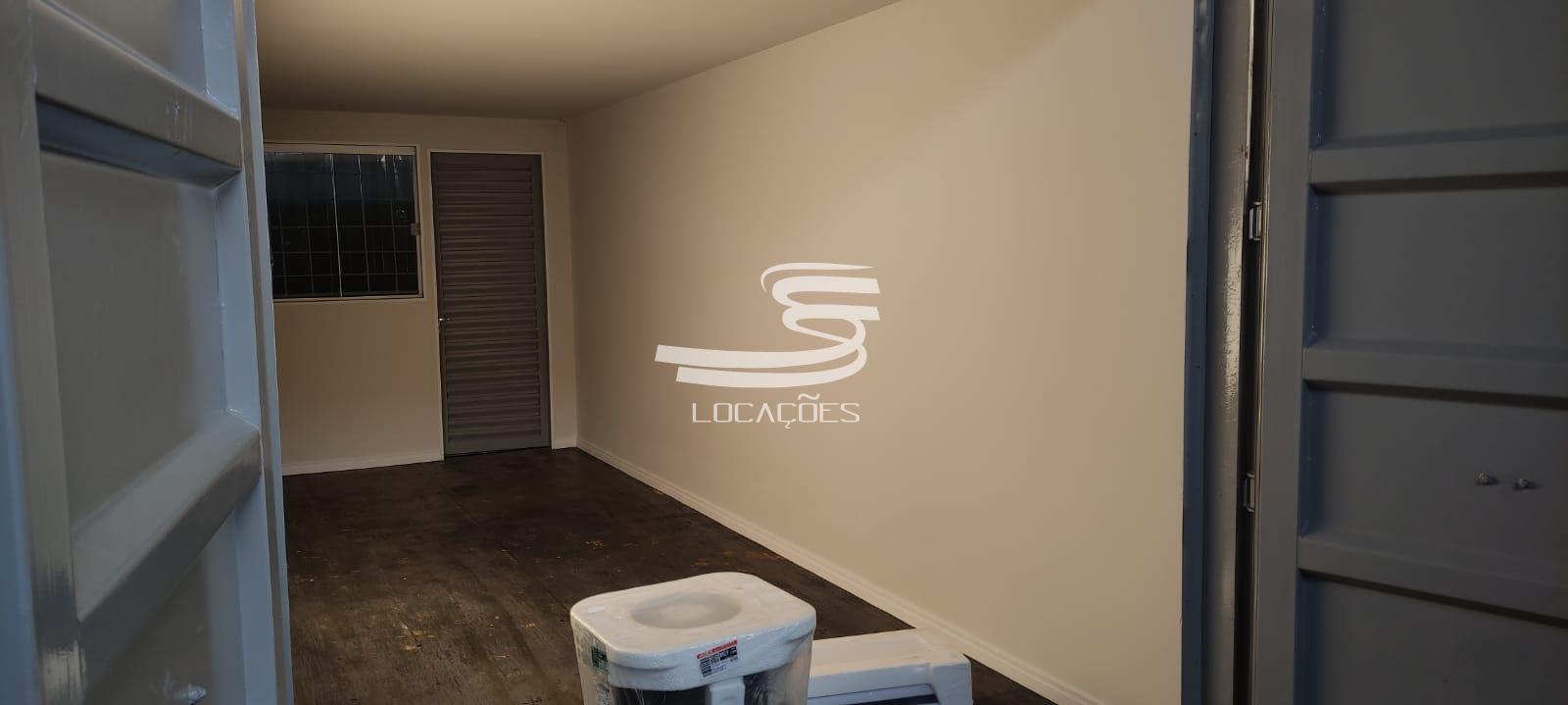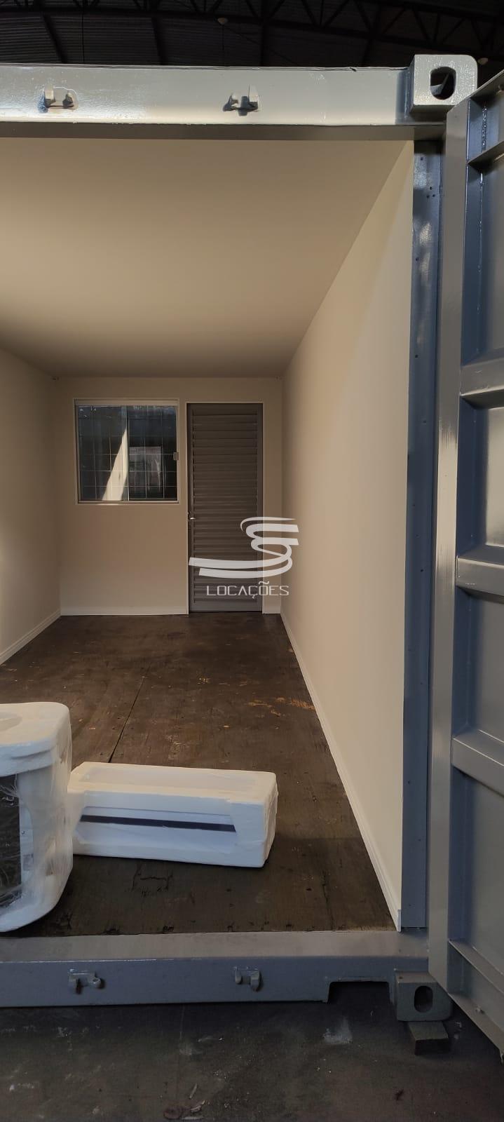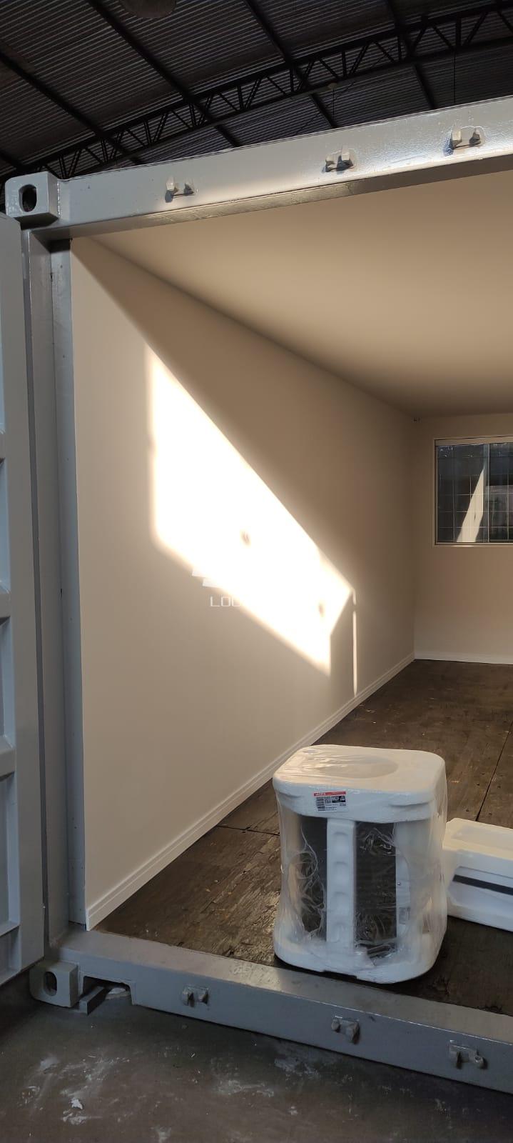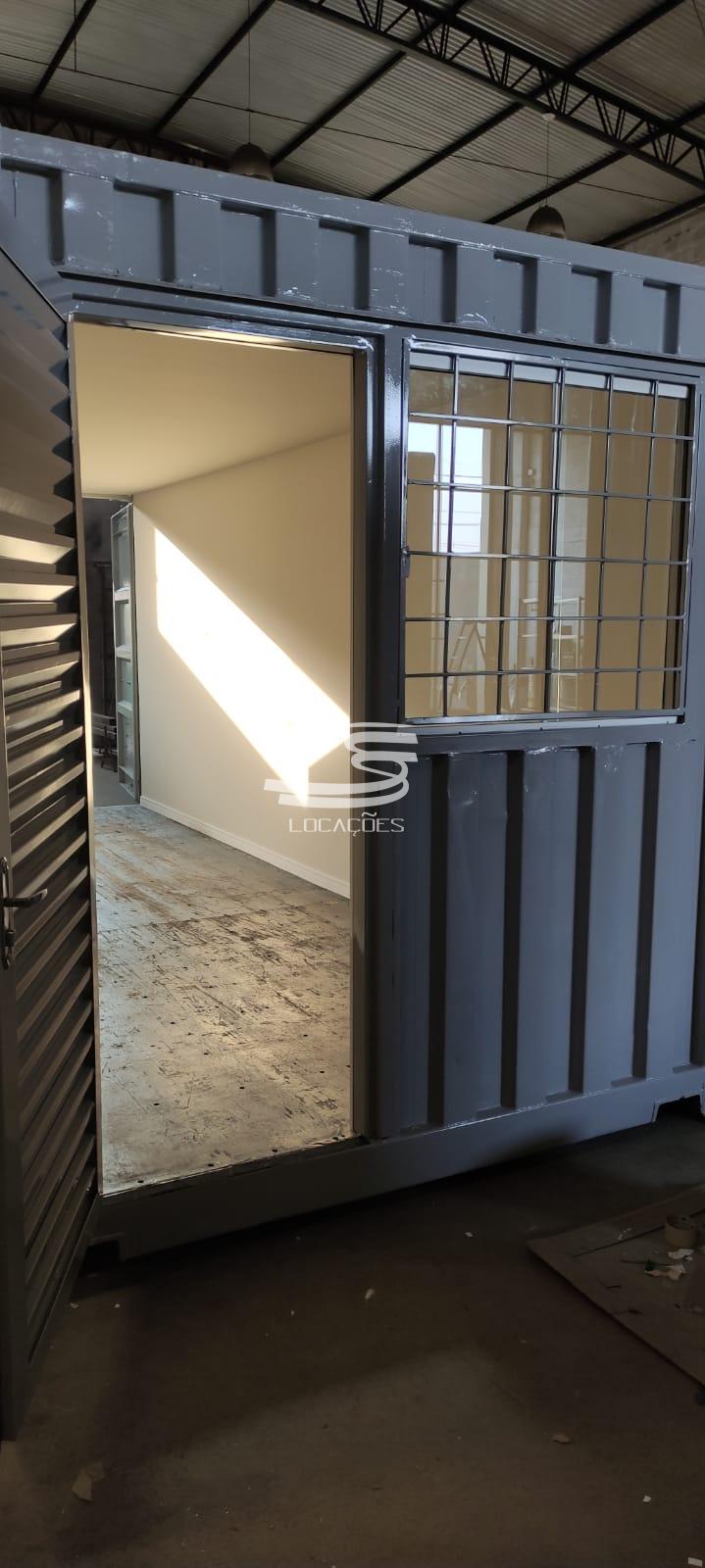 Escritório com porta 2,10 x 0,80 de giro metálica para acesso externo, a sala possui janela blindex 1,0 x 1,0 m e grade de proteção anti roubo. Escritório com revestimento térmico e acústicos completo nas paredes e teto, piso próprio do container lixado e envernizado